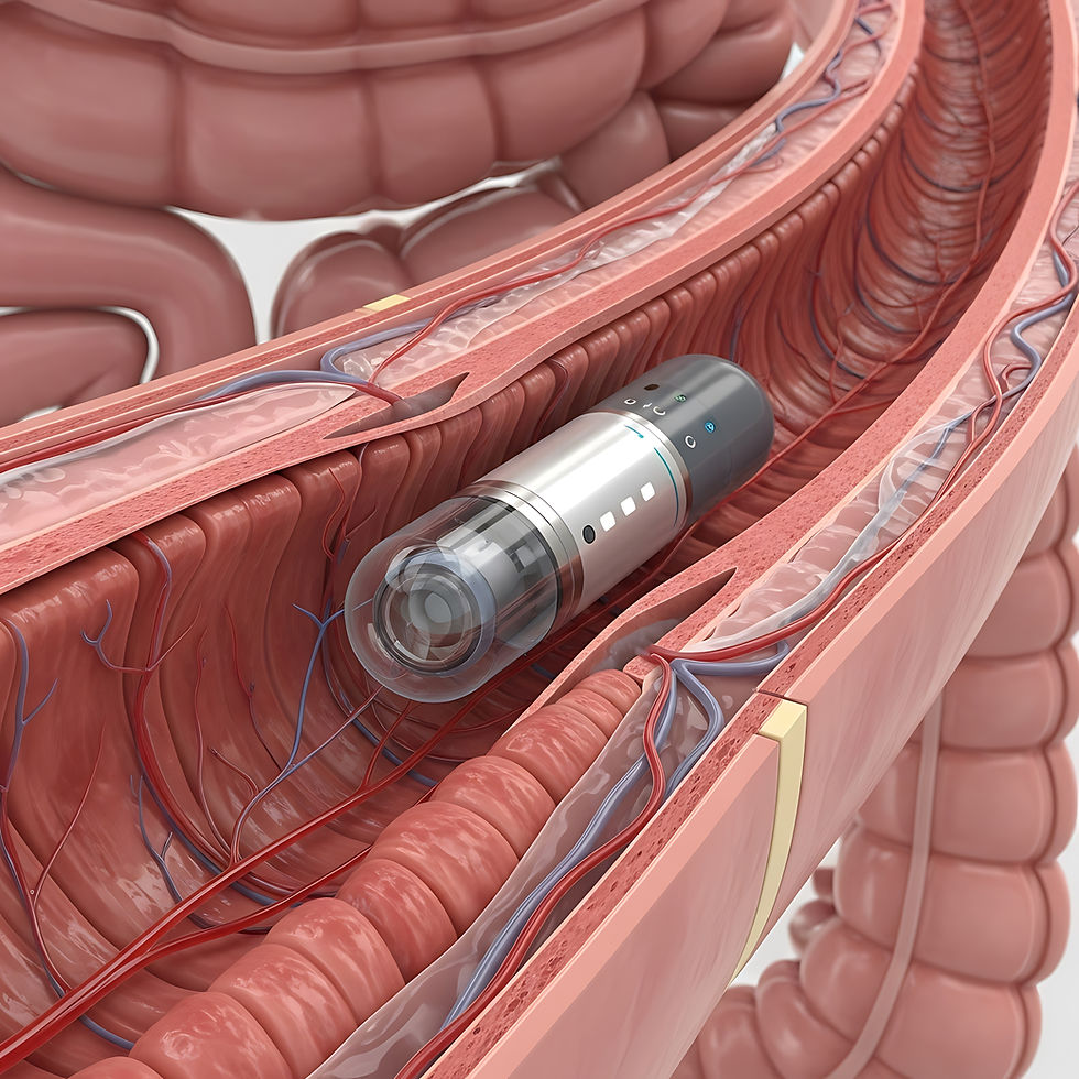 A capsule endoscopy (pill cam endoscopy) uses a pill cam that you swallow that contains a miniature video camera. The camera sends pictures to a data recorder, which you will wear on a belt